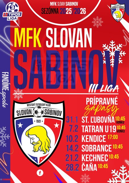 Pozývame Vás na futbalový štadión v Sabinove, kde futbalisti MFK Slovan Sabinov odohrajú prípravné zápasy pred jarnou časťou futbalovej sezóny 2025/2026. Na domácom ihrisku si zmerajú sily s klubmi: